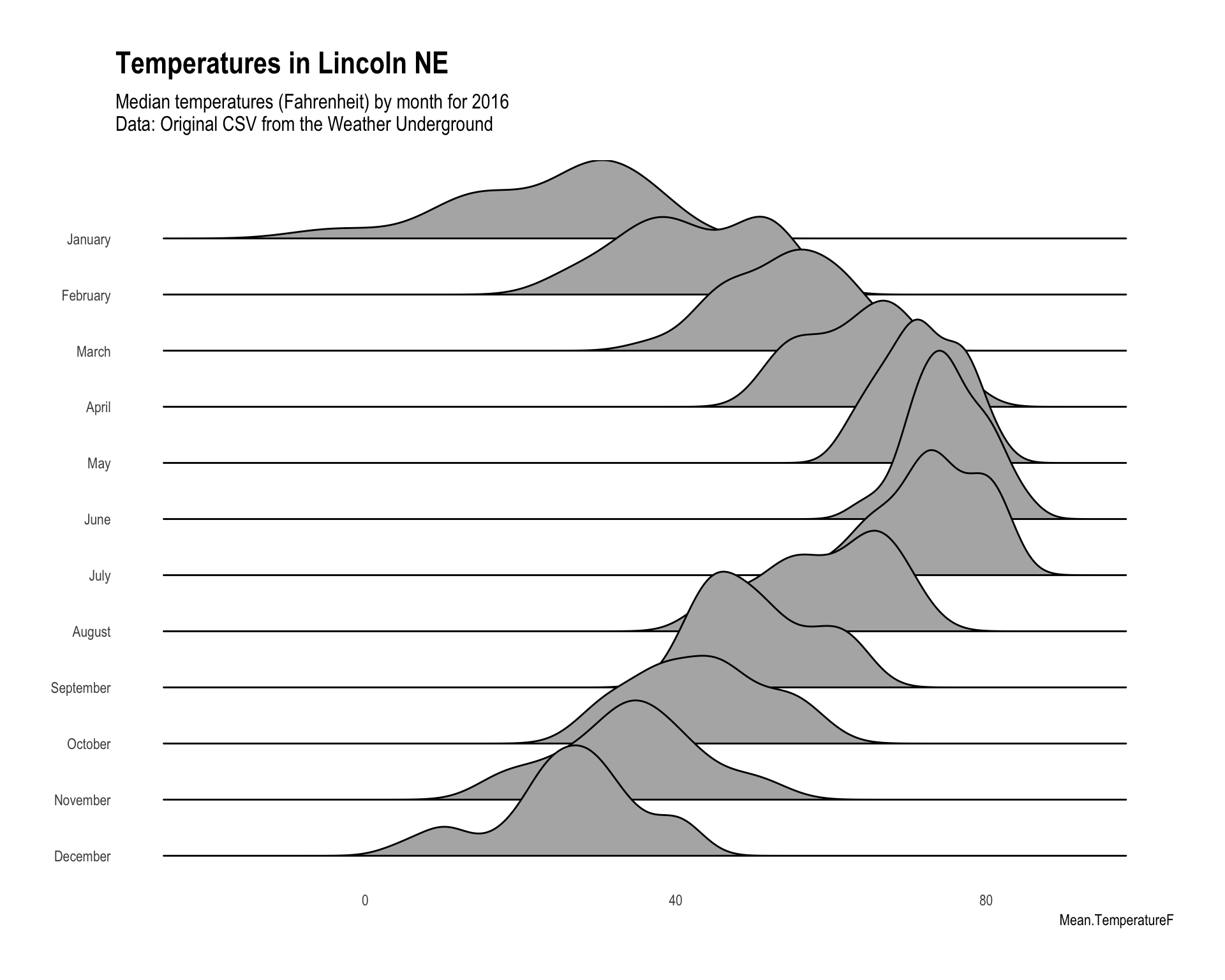 subtitle='Median temperatures (Fahrenheit) by month for 2016\nData: Original CSV from the Weather Underground')