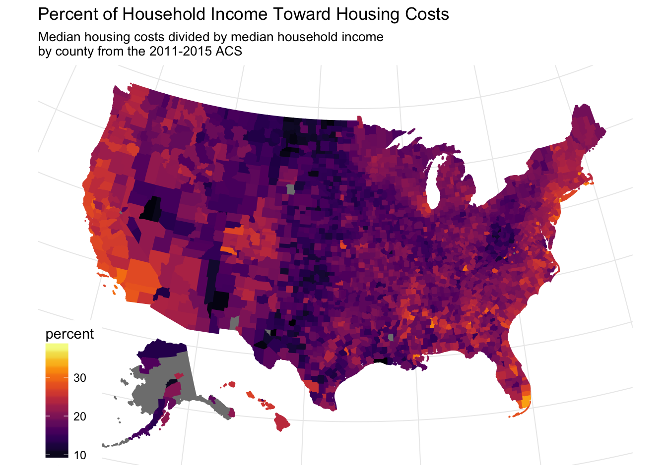 Interesting. It seems like some of the darkest areas correspond with big metropolitan areas. I think it would be more interesting though if we could compare that median household income to something else. Luckily all we have to do is make another pull, this time for table ‘B25105_001’, which corresponds to the median monthly housing costs. Then we just calculate the percent and plot it replacing just the ‘fill’ and ‘color’ elements.