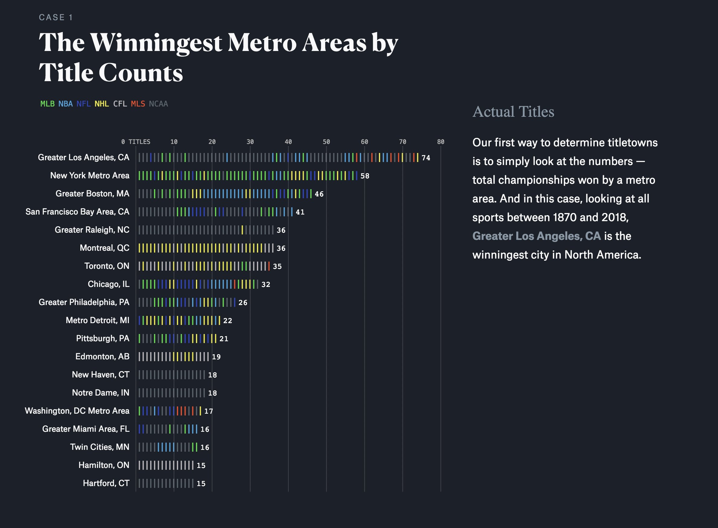 The Pudding is known for some amazing scrolly-telling pieces and this past week I came upon one such story: What makes a titletown?. This article sets out to answer the question, ‘Of all the cities to field a professional or college level team in the last 150 years, which is the winningest?’. The article is fascinating but the thing that caught my eye was the interactive visual for Case 1.